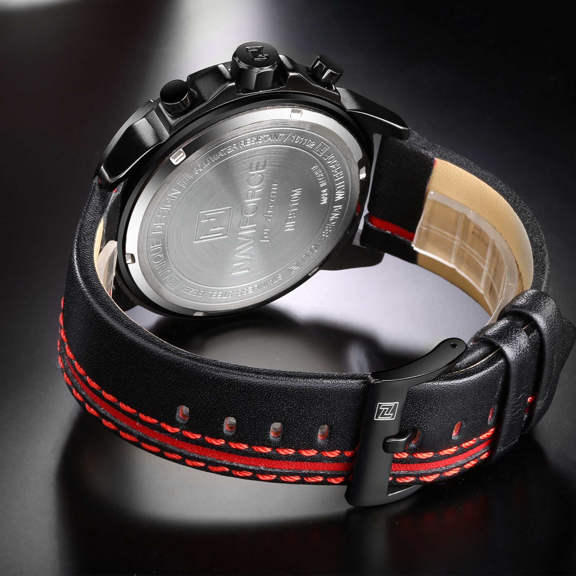 - جنس بند: بند چرم مشکی که به زیبایی و راحتی ساعت افزوده و با نوار قرمز، ظاهری بینظیر ایجاد میکند.